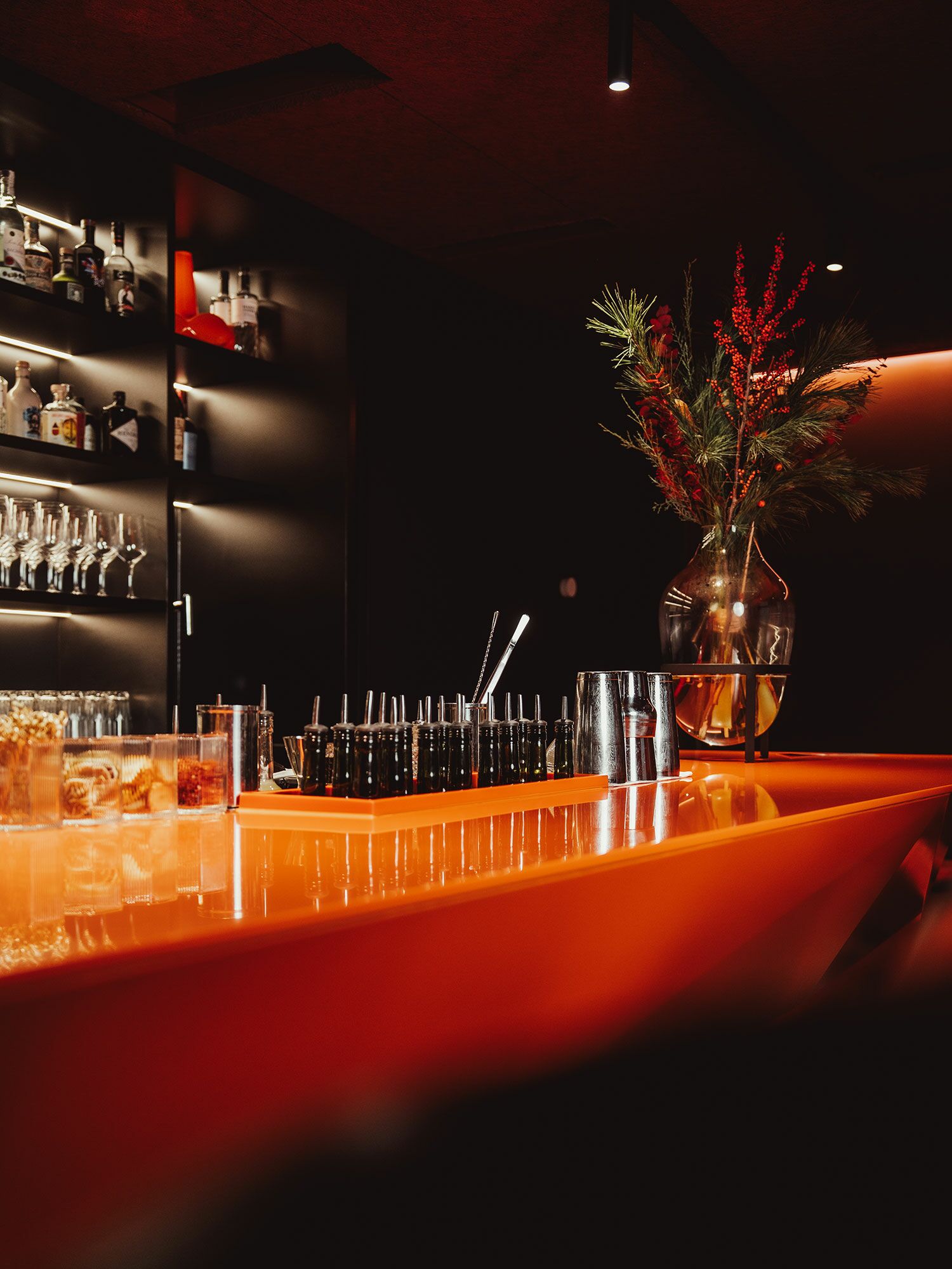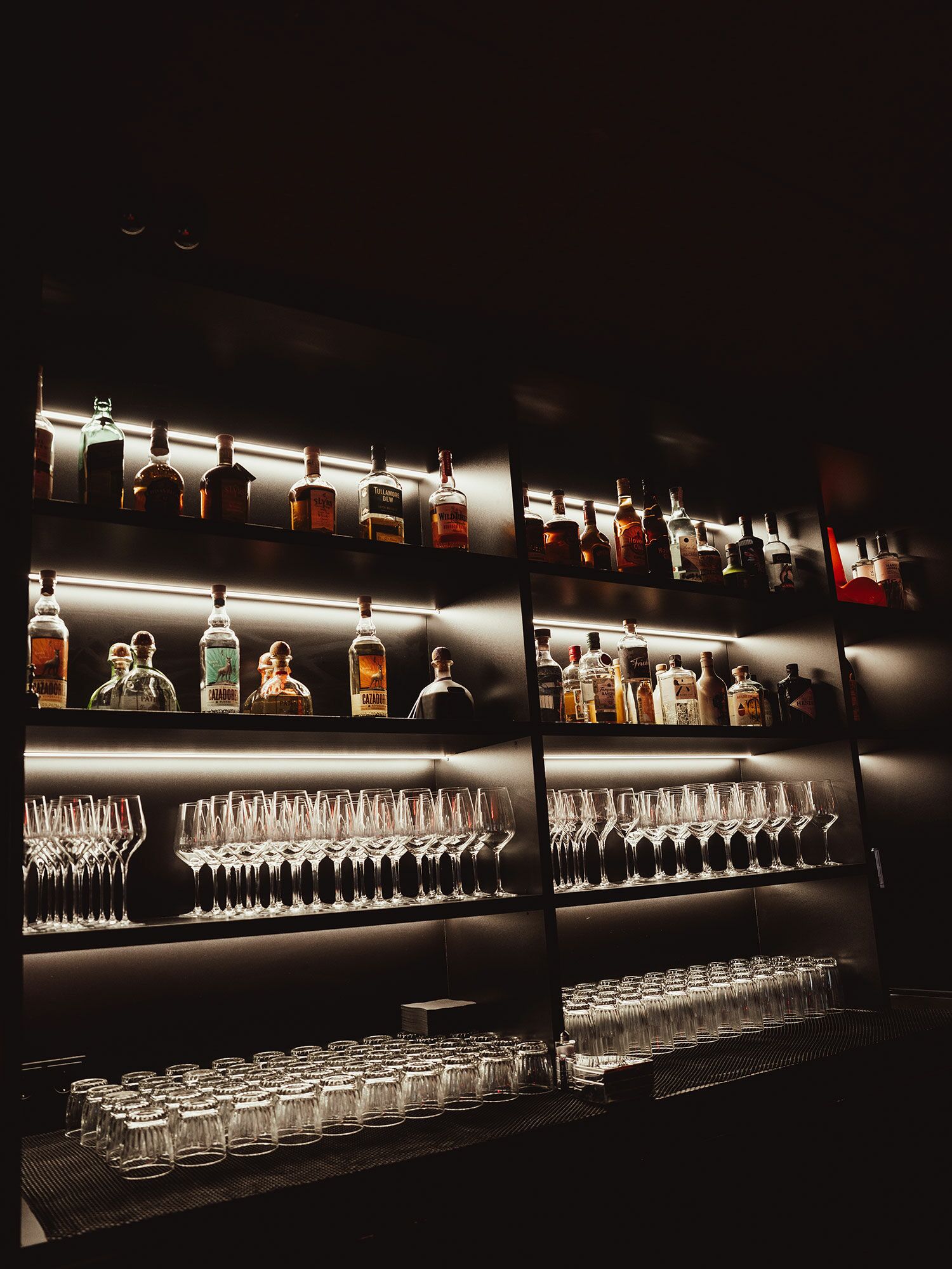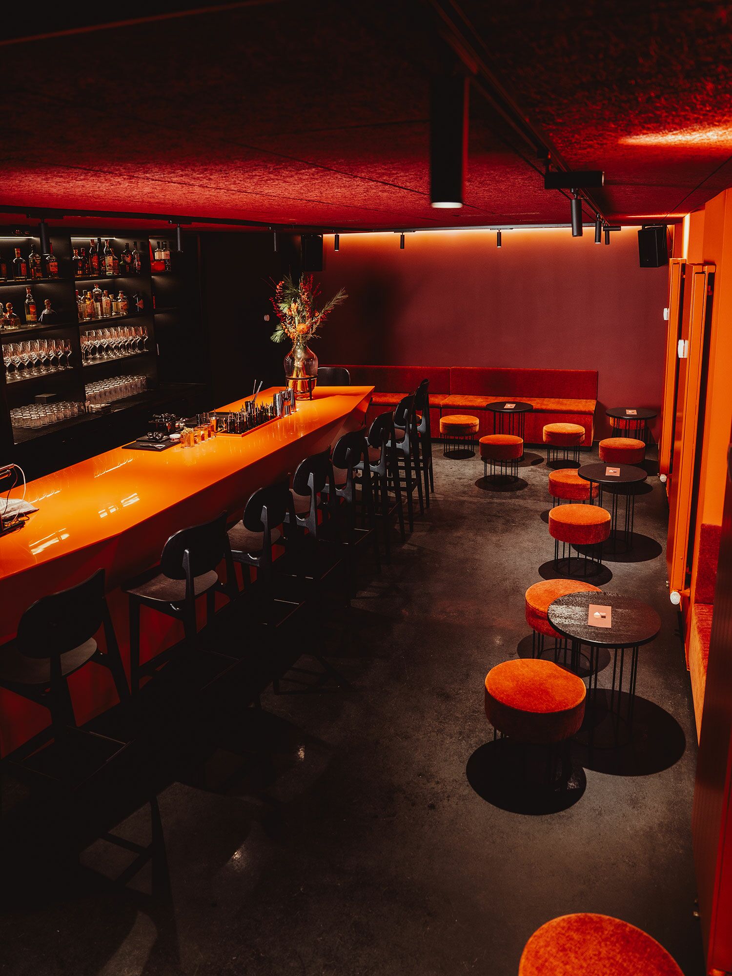 Im Rahmen dieses Interieur-Projekts verantworteten wir Theke, Regaleinbauten, WC-Bereich sowie die Bepolsterung. Die rückseitigen Backbar-Regale wurden von uns entworfen, gefertigt und montiert, bestehende Wandflächen erneuert und mit Schichtstoff belegt.
