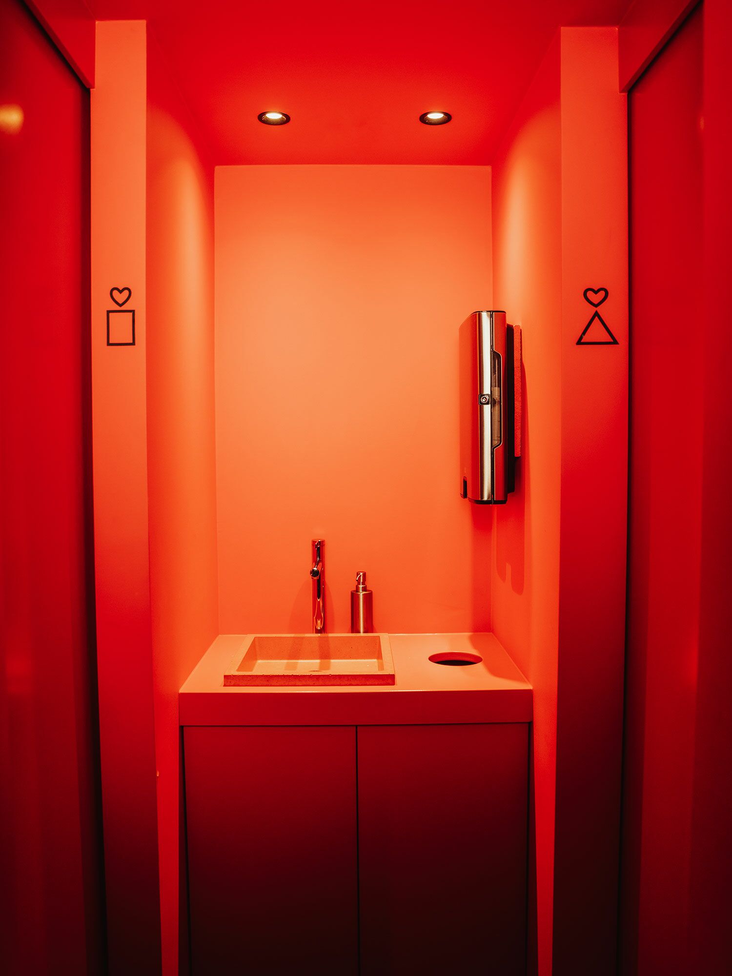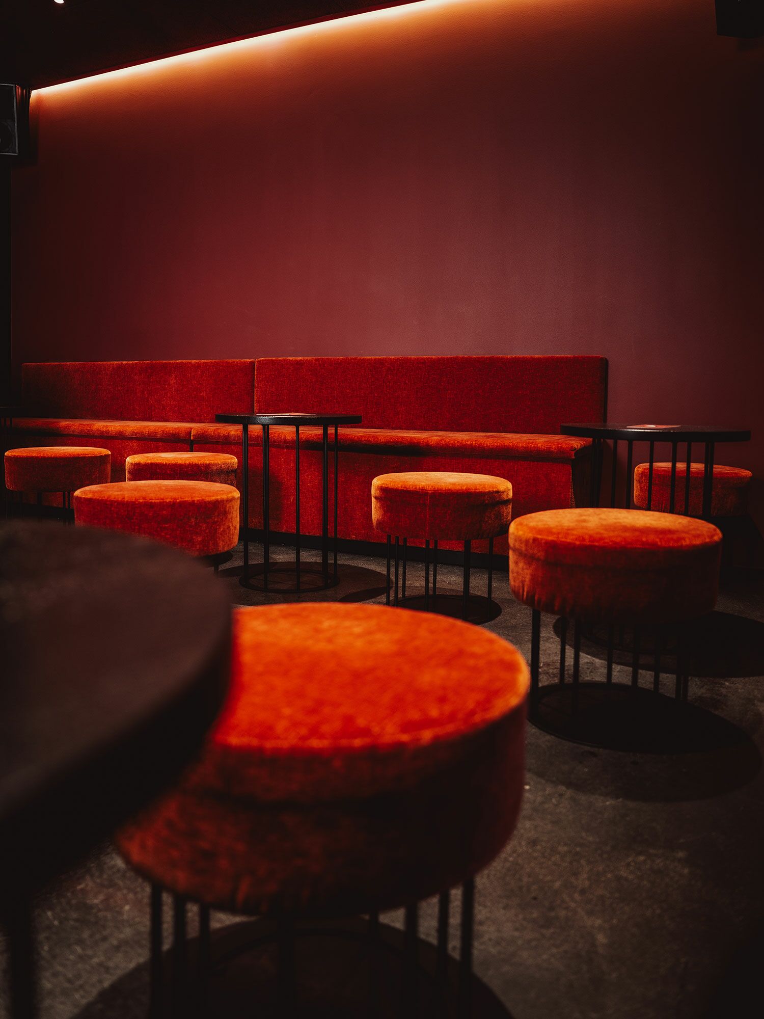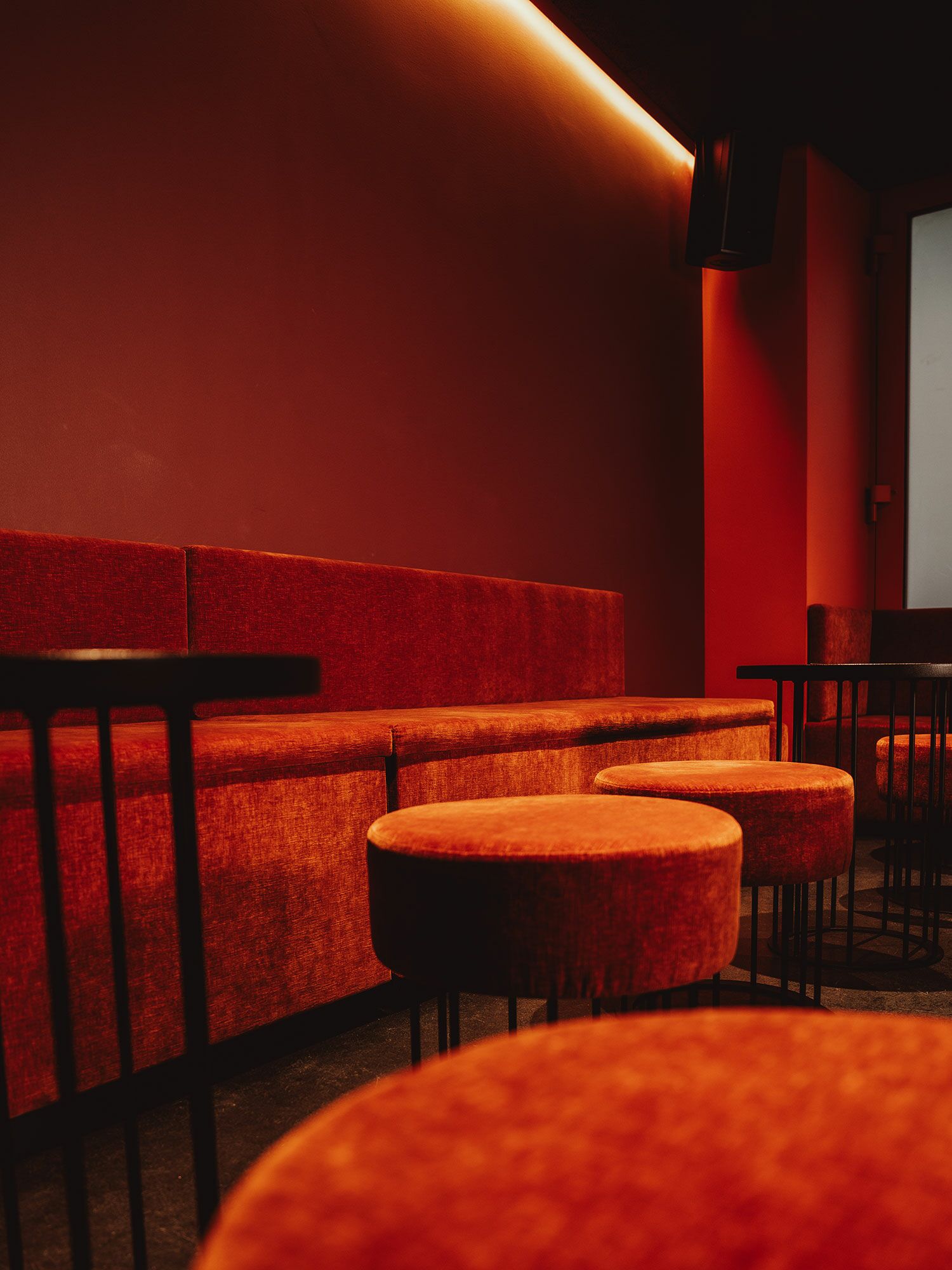 Die Theke erhielt eine neue Lackierung sowie eine passgenaue Mineralwerkstoff-Platte. Der WC-Bereich wurde mit einem lackierten MDF-Waschtischunterschrank und einem farblich abgestimmten Betonwaschbecken neu gestaltet. Ergänzt wird das Projekt durch rosé lackierte Türen, Beistelltische aus schwarz gebeizter Eiche sowie maßgefertigte Sitzbänke mit integrierter Subwoofer-Lösung.